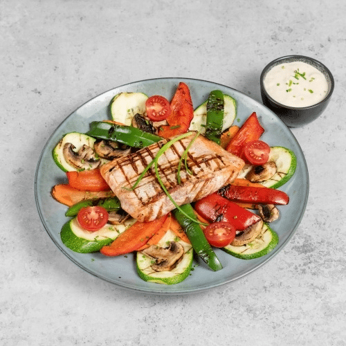 Eén portie malse zalmfilet op een bedje van groente en champignonsaus