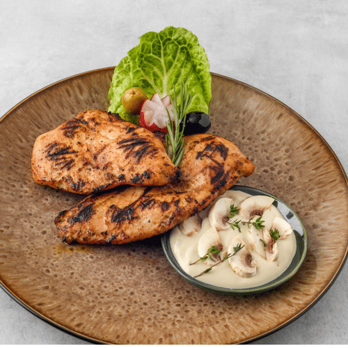 4 kippenvleugels, 3 krokante kipstrips, 1 st.kipfilet, 3 kip rollo's en een halve mais met champignonsaus