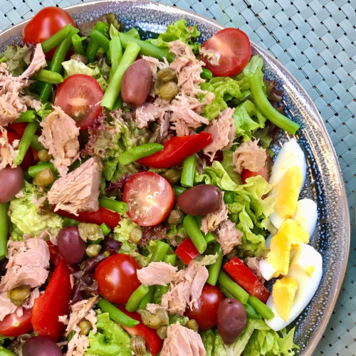 Sla, tonijn, ui, olijven, tomaat, komkommer, maiskorrels en salade dressing